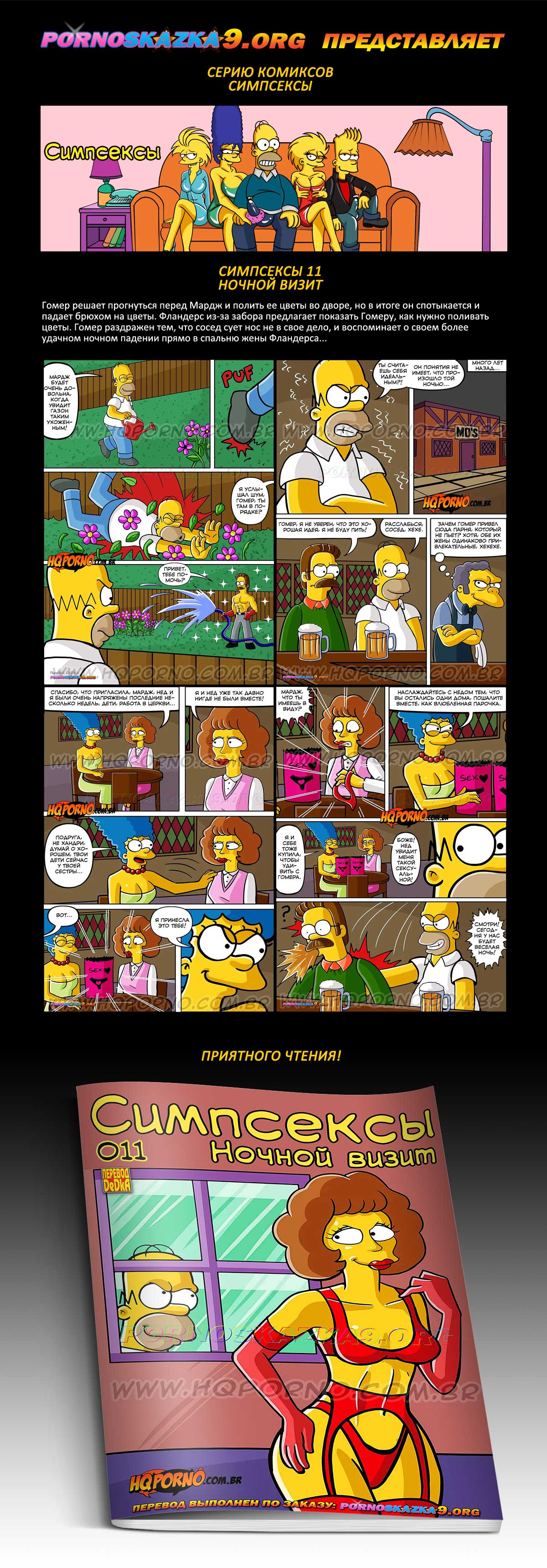 Порно комикс Симпсексы. Часть 11. Ночной визит. Гомер решает прогнуться перед Мардж и полить ее цветы во дворе, но в итоге он спотыкается и падает брюхом на цветы. Фландерс из-за забора предлагает показать Гомеру, как нужно поливать цветы. Гомер раздражен тем, что сосед сует нос не в свое дело, и воспоминает о своем более удачном ночном падении прямо в спальню жены Фландерса…